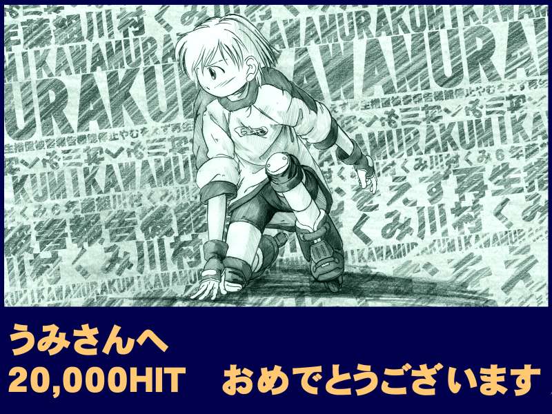 迷子のもぐらHPのデュマさんから20000ヒット記念イラストをいただきました! かっちょぇ〜くみちゃんです。なんかもらってばかりで申し訳ございませんです。 ありがとうございます!お礼に何か必ず贈らせていただきます! 2001/11/05