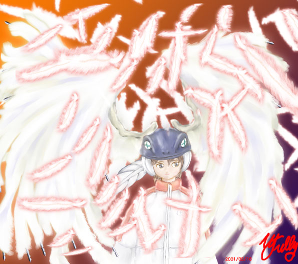 う〜ん、光を纏った羽根が美麗ですよねっ!ぐみちゃんも とても穏やかそうでボウグともよい関係なのでしょうか。 実は私も校長先生の小学生時代を考えてましたのです〜。 お菓子のいっぱい入ったリュックしょって(笑)あとブルマかな。 |